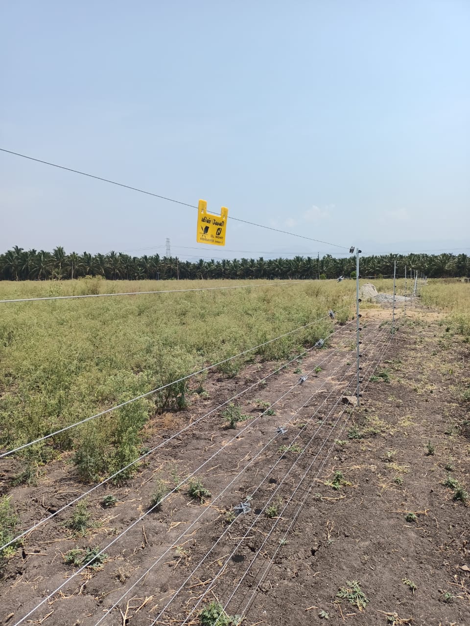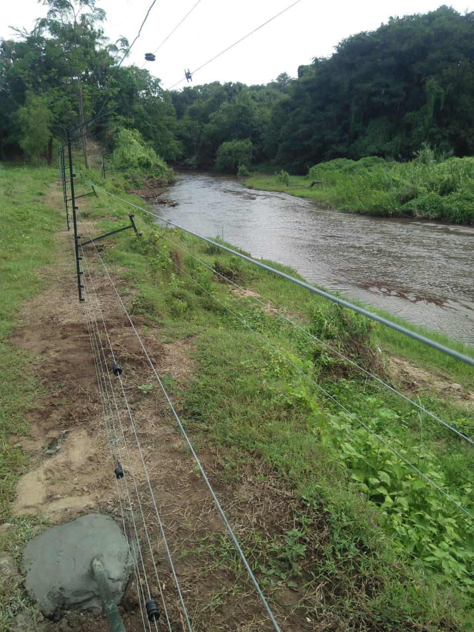 Our Hanging fence is a pair of fence wherein the Primary fence is upto 14ft tall. The pole interval is designed to be at much longer span than conventional. Energized wires are dropped downwards akin to a curtain. It is common phenomenon that elephants are habitual to uproot the poles. In the curtain fence, the suspended wires ensure elephant does experience the shock when in contact with the Energized wires and in the absence of poles the elephant is unable to uproot the poles.
